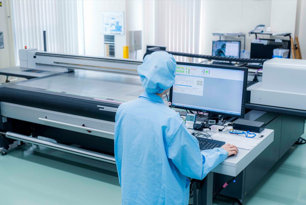 スクリーン印刷は枚葉にて印刷いたします。両面テープの貼り合わせや抜き加工など、枚葉印刷後の加工設備も保有しています。検査工程では目視検査、仕様、製品サイズ等によってはカメラ検査も実施しております。